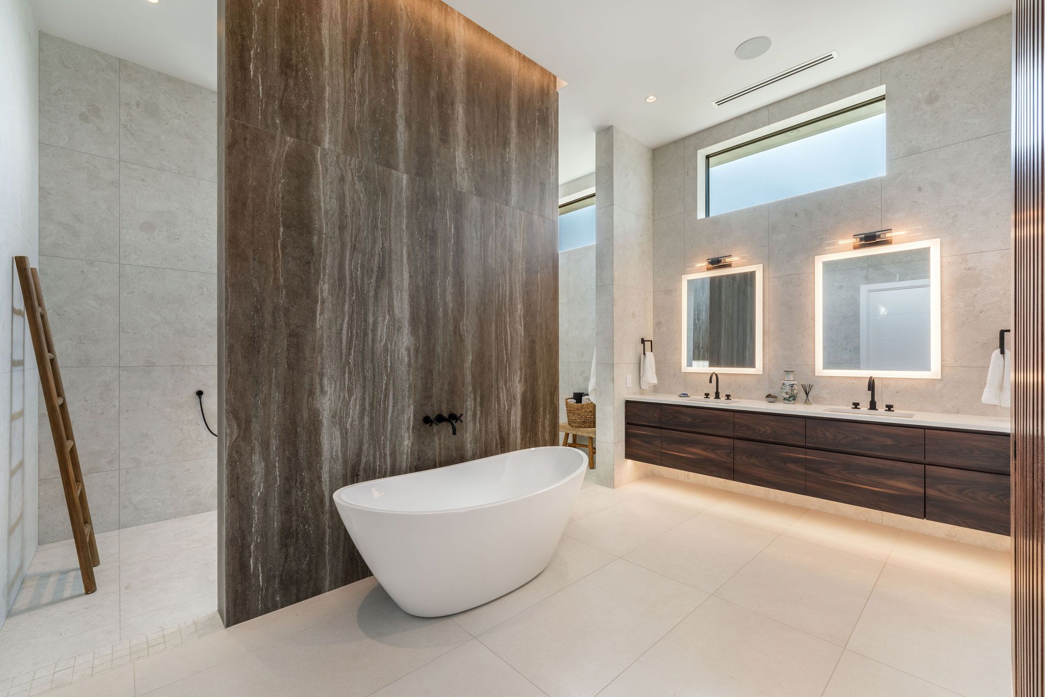 No detail has been overlooked: blackout Lutron blinds, a smart home system, double garage, elevator-ready shaft, and eco-conscious touches including solar panels, a cistern, and gas fittings. The home comes fully furnished in a relaxed, luxe-bohemian style refined yet welcoming.
