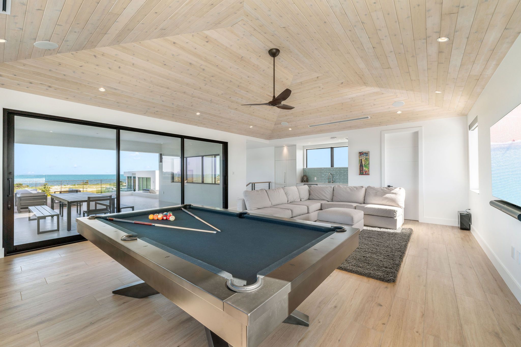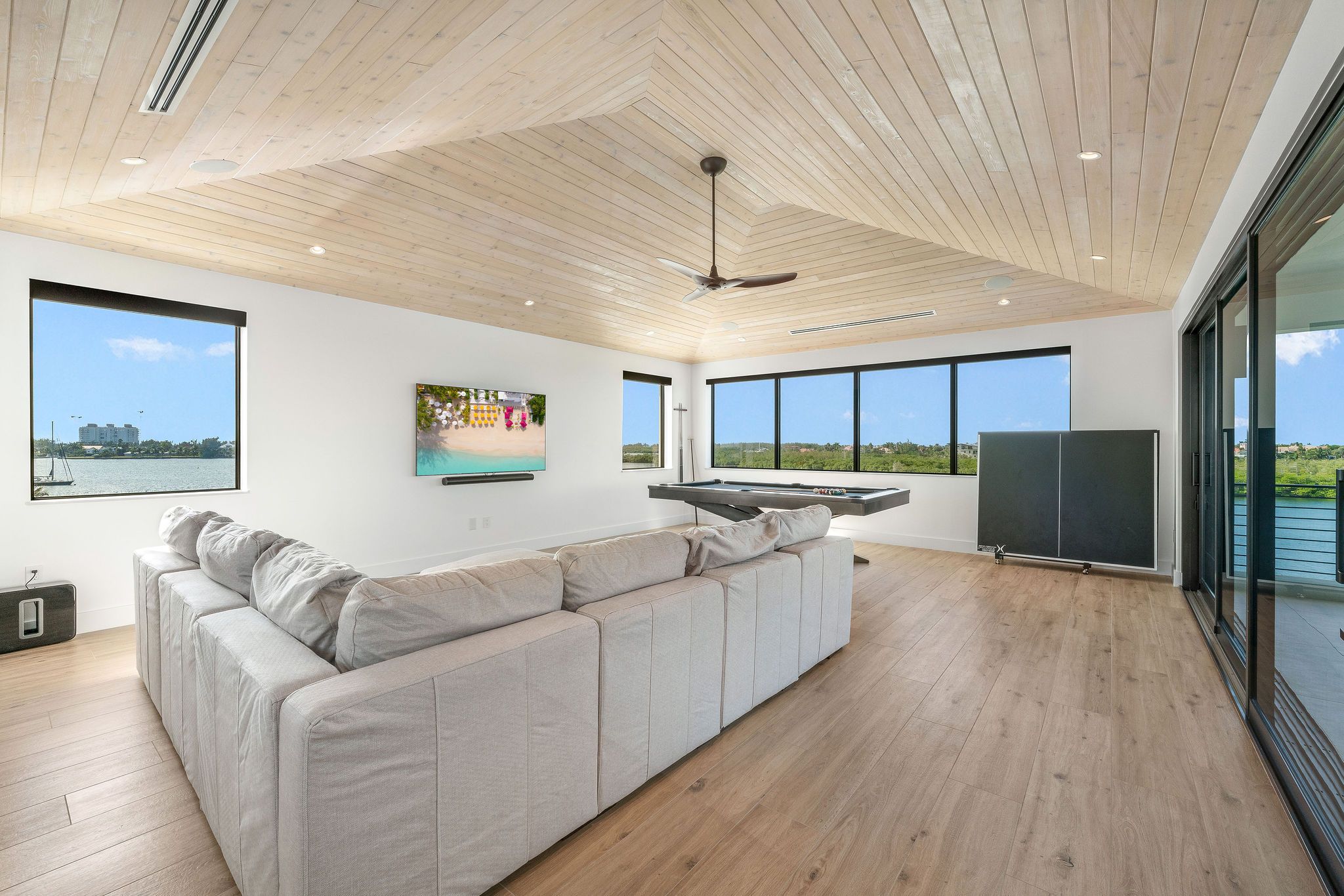 The upper level features a dedicated entertainment space with a kitchenette, full bathroom, and dumbwaiter, and offers a panoramic-view terrace perfect for sunsets over the water.