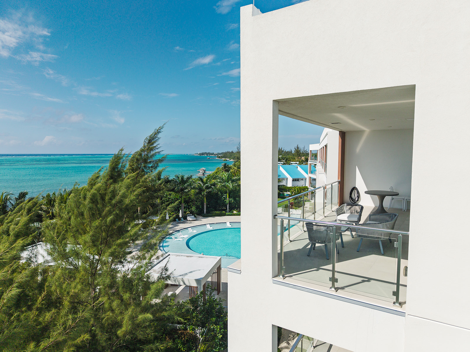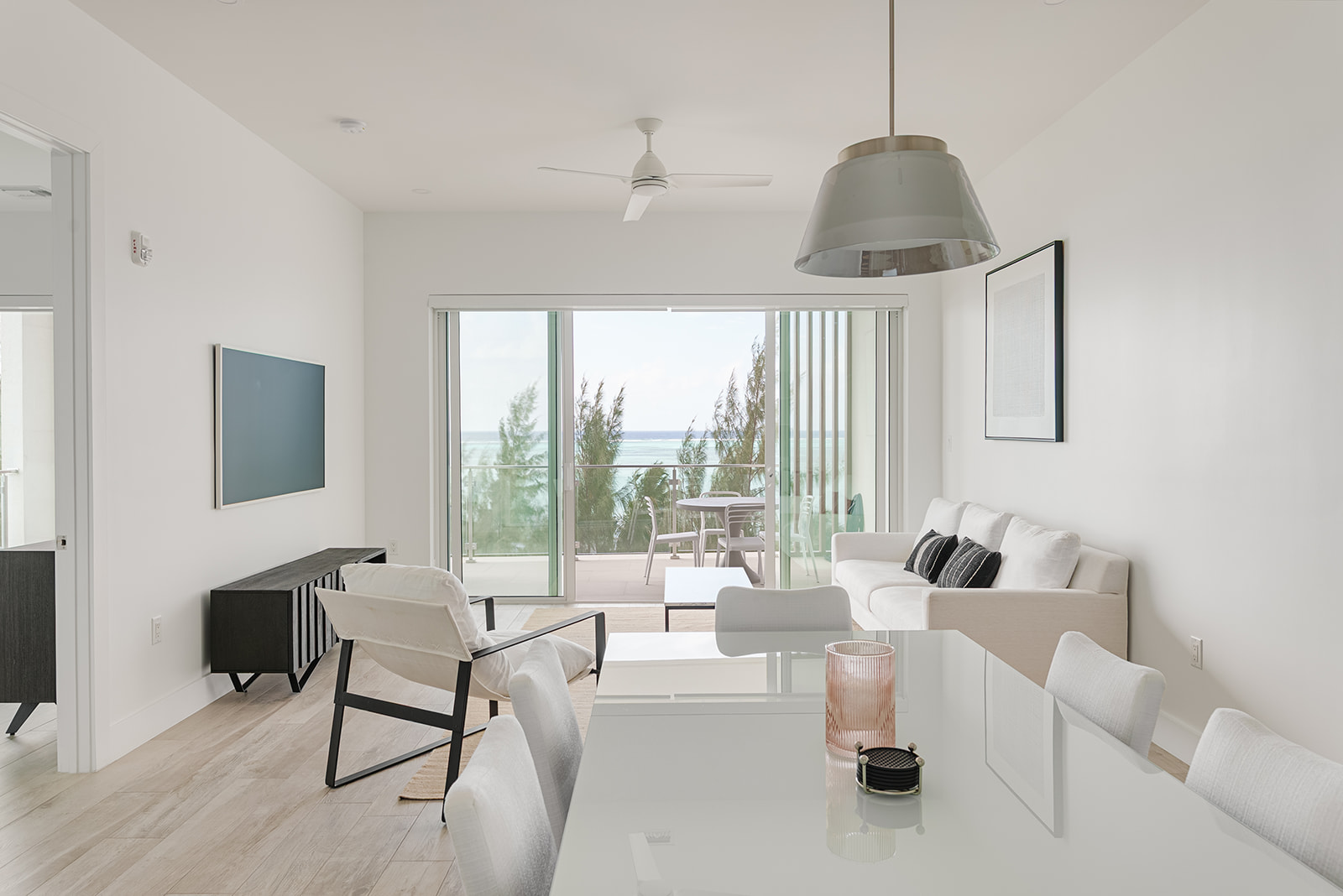 The open-plan kitchen, living, and dining areas are oriented toward the water, with large glass doors that draw in natural light and open onto an expansive patio. Whether hosting friends or enjoying a quiet evening outdoors, the terrace becomes a true extension of the living space, with elevated views that stretch across the Caribbean Sea.