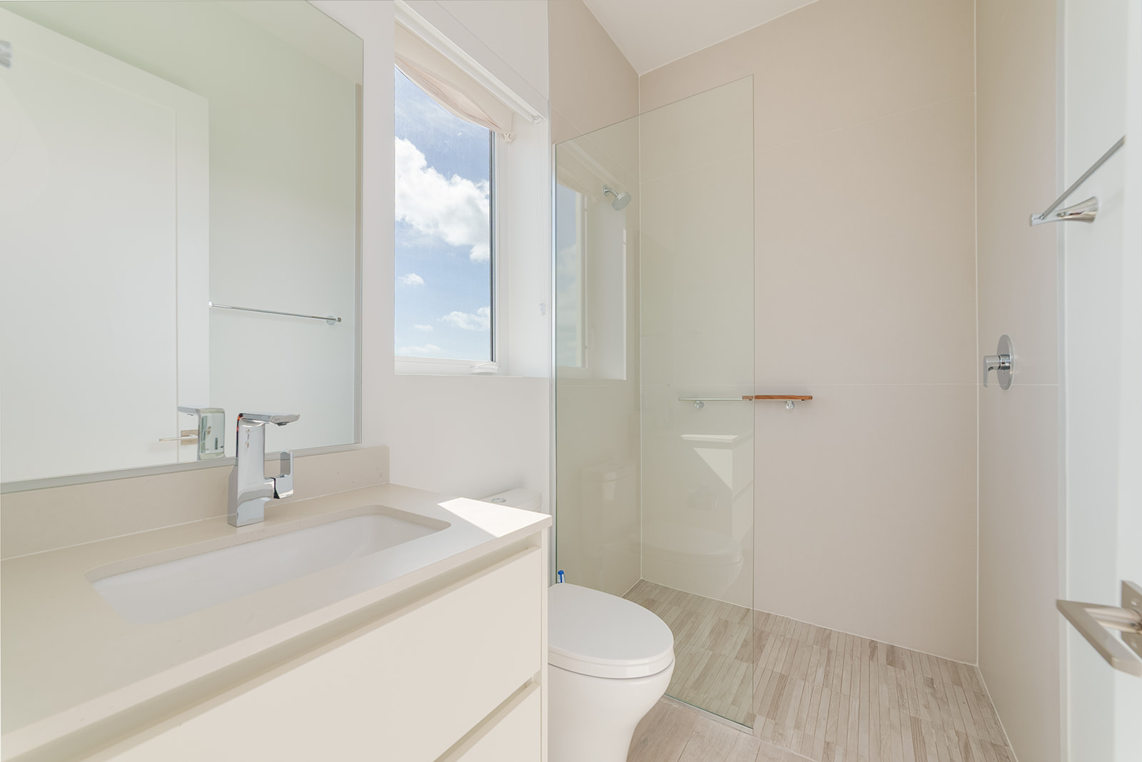 All three bedrooms feature en-suite bathrooms, creating privacy and comfort for both residents and guests. The primary suite enjoys ocean views and a generous bathroom, while a separate laundry room and additional powder room add everyday practicality.