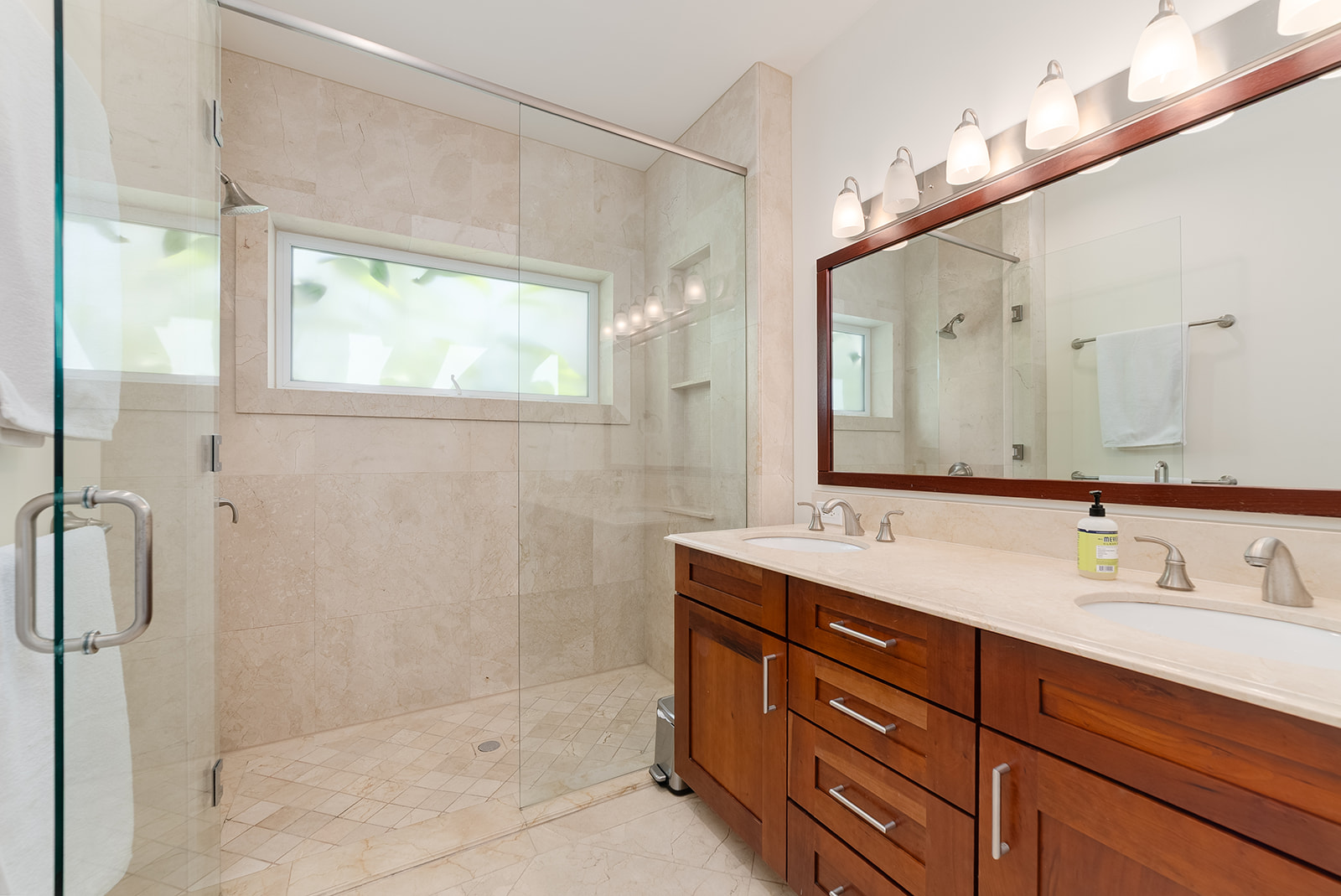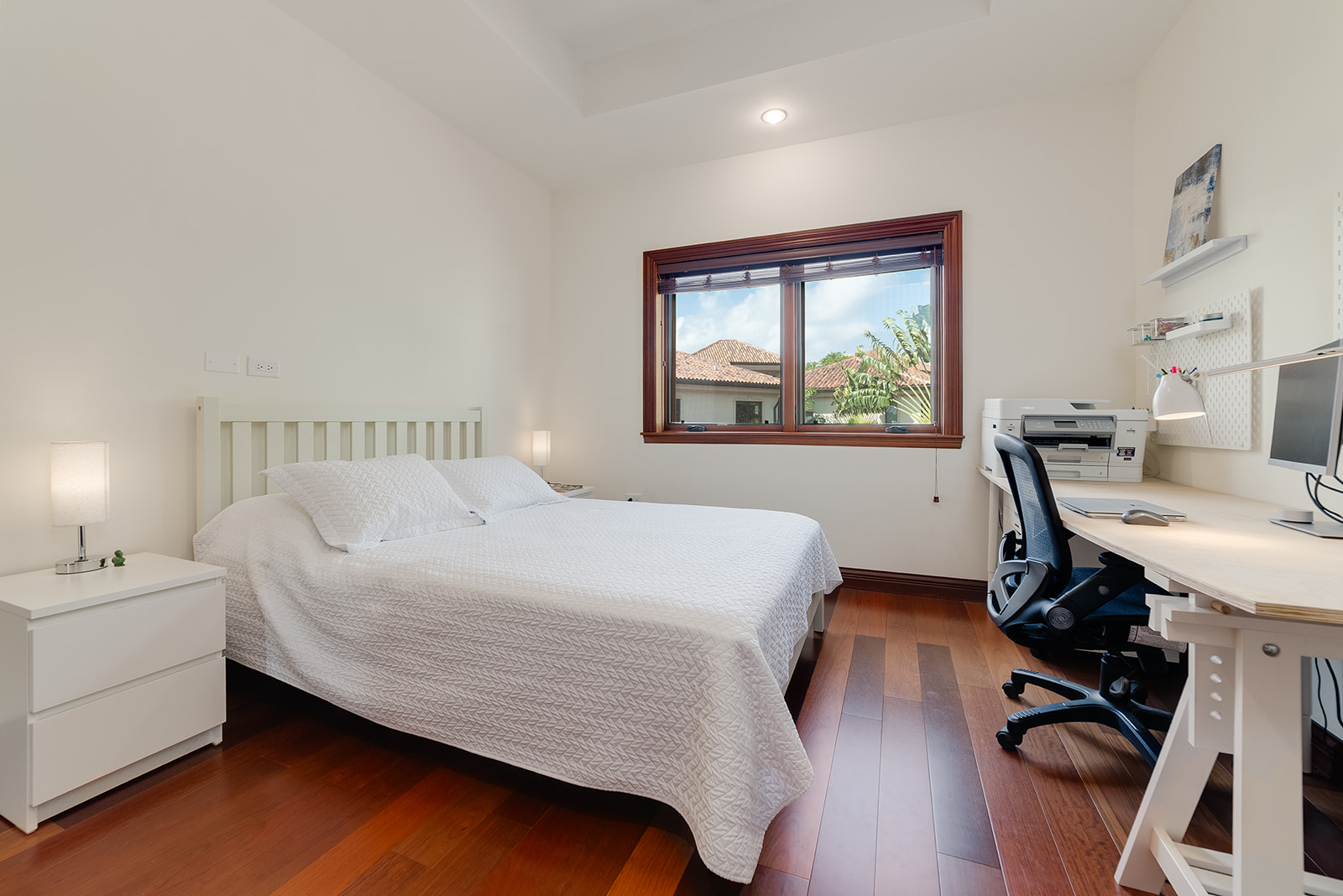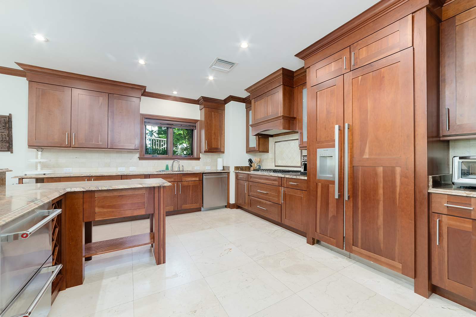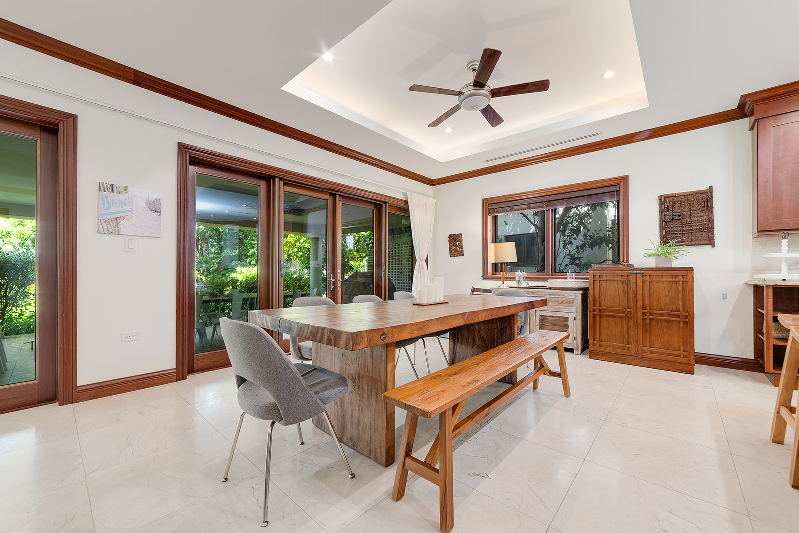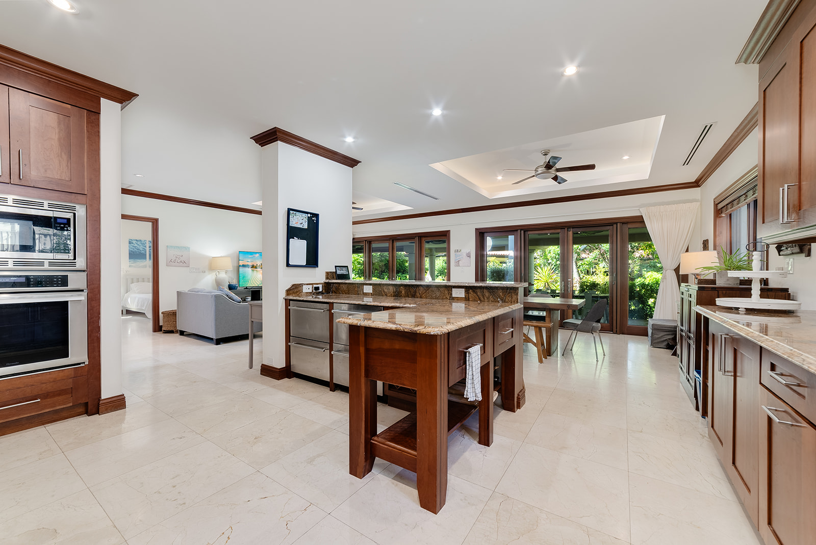 Enjoy open-concept living with a gourmet kitchen, spacious indoor/outdoor entertaining areas, and high-end finishes throughout—from travertine floors to custom mahogany woodwork. Wizard Screens in the living and dining areas allow you to leave the doors open when the weather is cool, enhancing the seamless flow between indoors and out. Two generous primary suites (one on each level), a private office nook, and a sprawling veranda complete the home’s versatile layout.