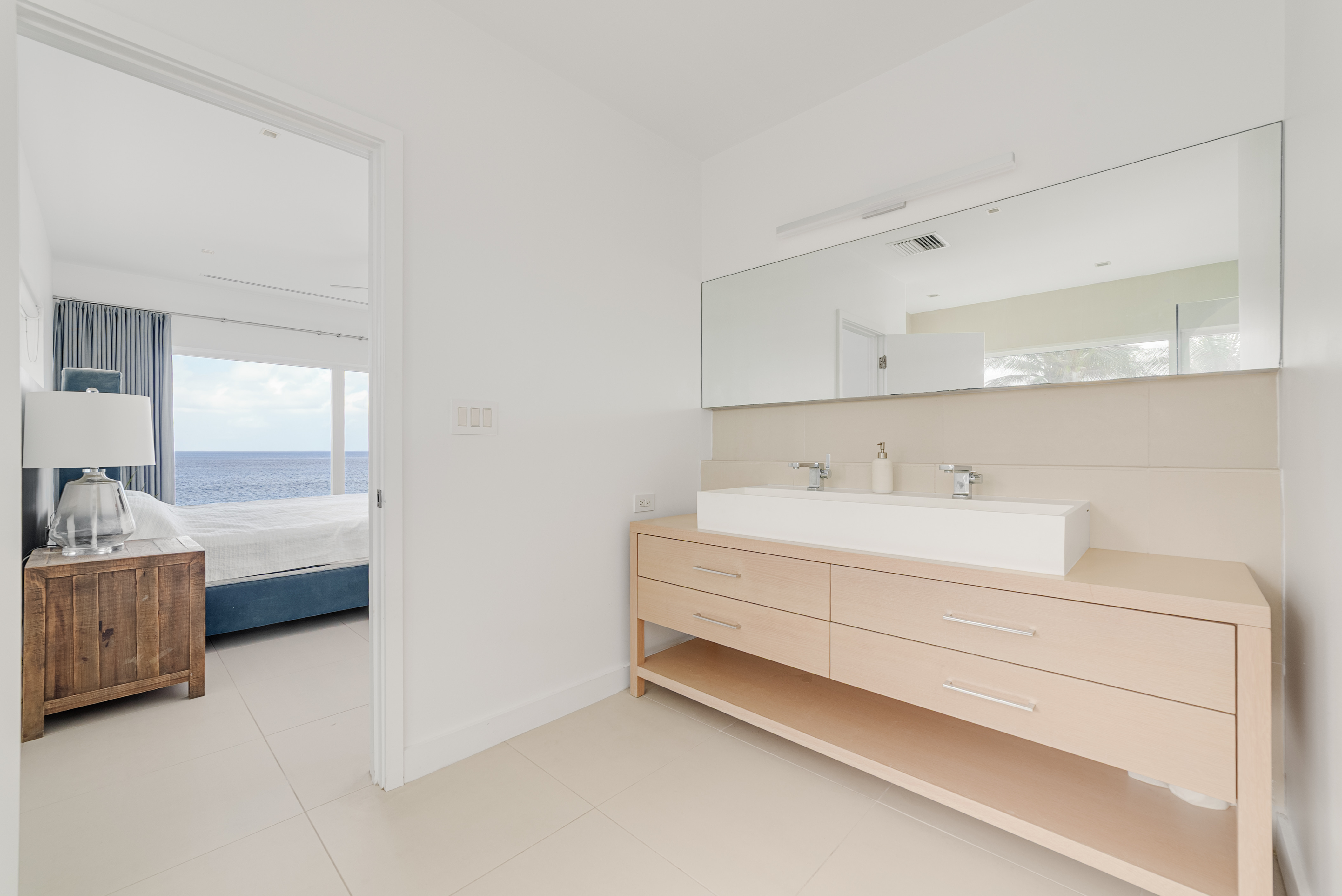 Situated on the second floor, the residence enjoys a serene vantage point above the shoreline. Expansive windows invite natural light to fill the interiors while framing uninterrupted views of the Caribbean Sea, creating a constant connection to the surrounding coastal landscape.