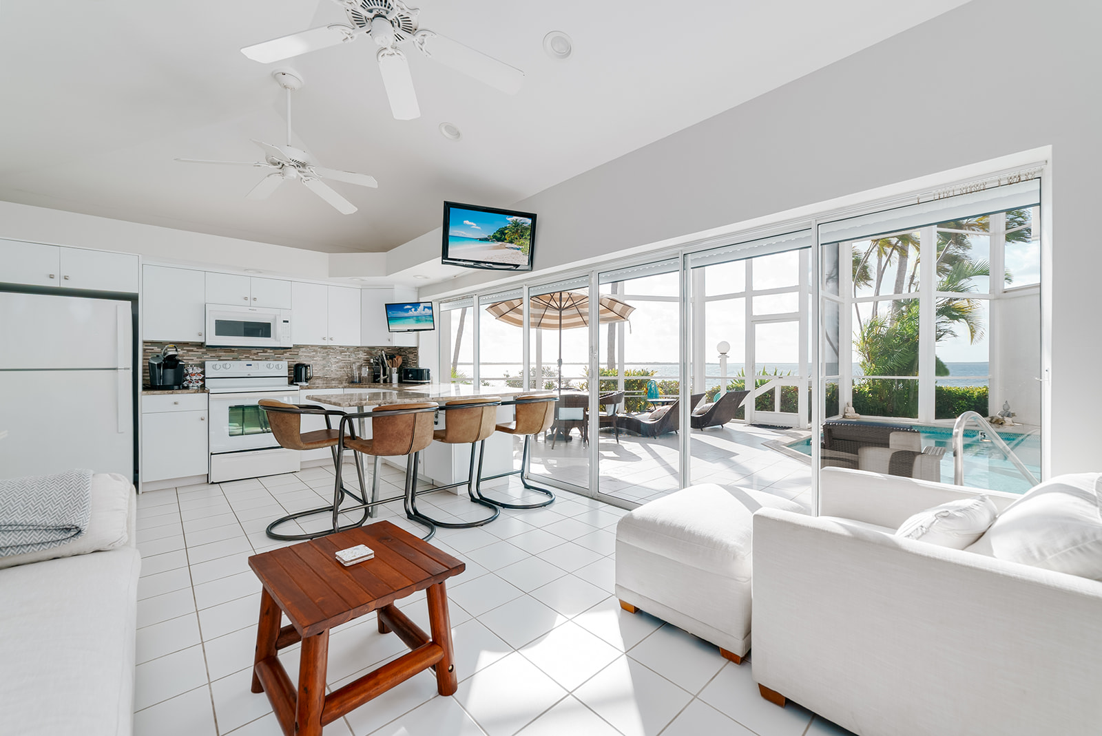 The signature architectural design of The Pools opens the entire living area onto your own fully screened, private pool—a seamless blend of indoor comfort and outdoor living found nowhere else in Cayman. Every room is oriented toward the sea, and both bedrooms enjoy gorgeous, unobstructed ocean views.