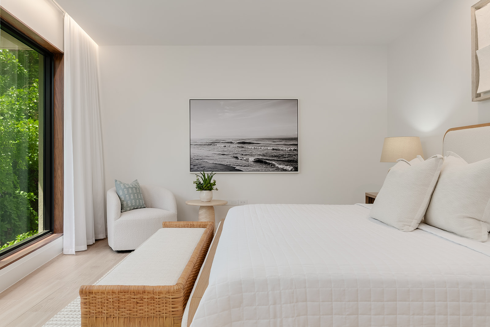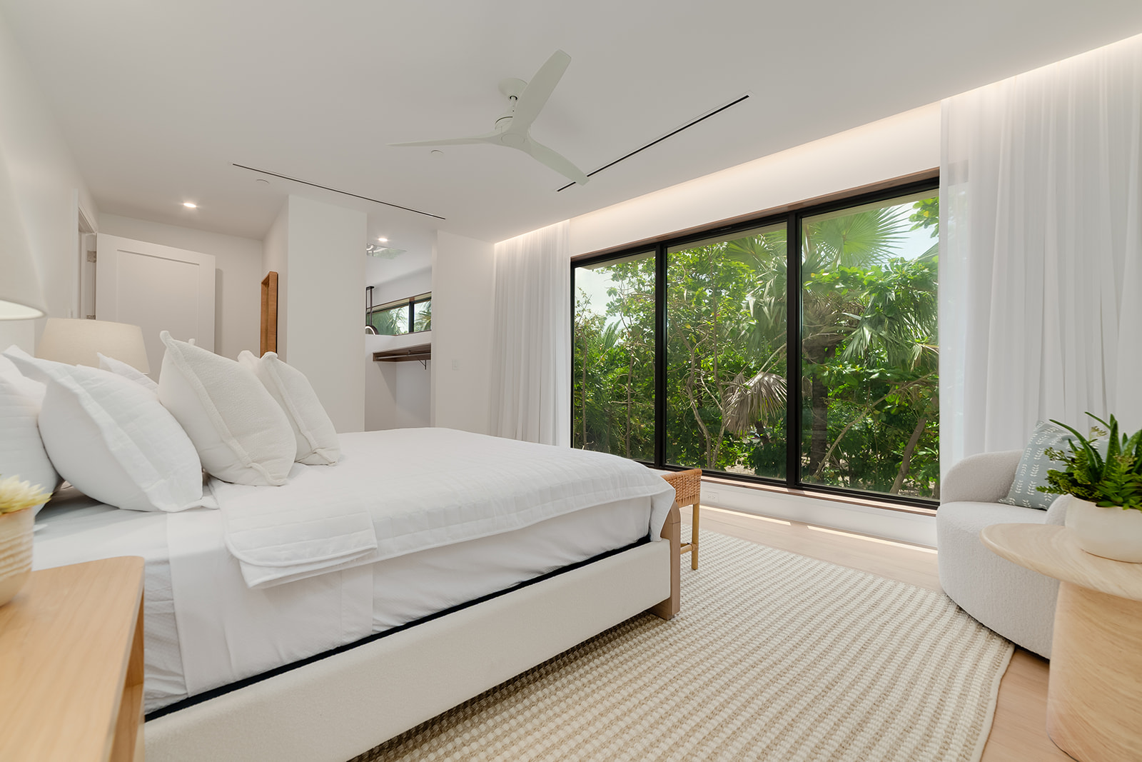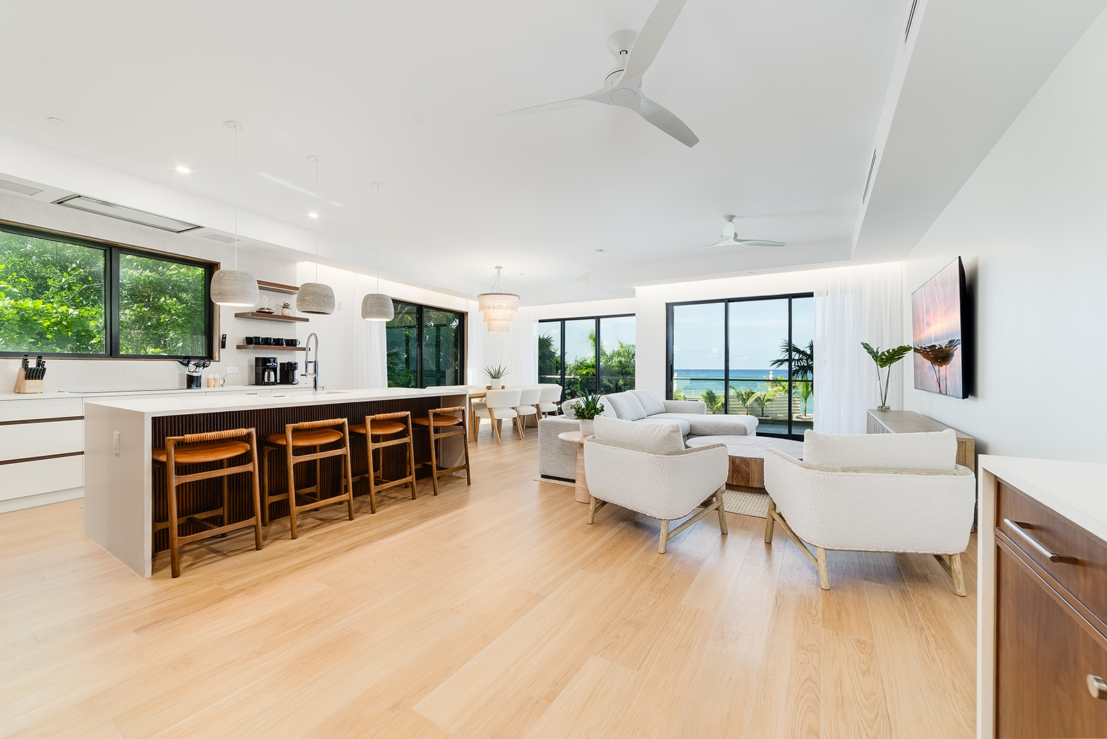 Immerse yourself in breathtaking panoramic ocean views from every residence, each boasting 30 feet of prime waterfront frontage. Expansive sliding glass doors seamlessly blend the indoor and outdoor living spaces, creating an unparalleled alfresco experience. In the primary bedroom, floor-to-ceiling windows stretch the entire length of the room, framing mesmerizing ocean vistas.
