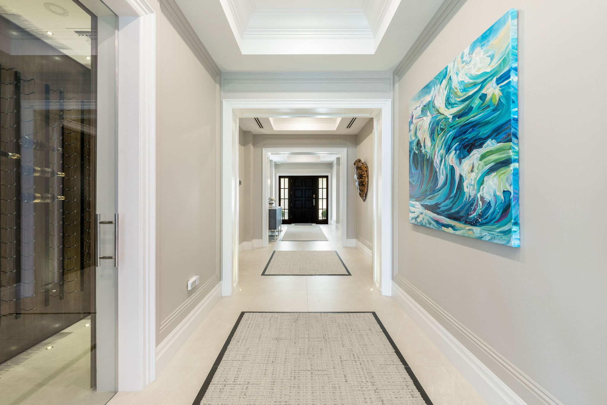 Upon entering this home, you’ll immediately notice the abundance of natural light flowing through wall-to-wall windows, offering panoramic ocean views. The open-concept design highlights the gourmet kitchen, featuring high-end appliances, sleek porcelain countertops and backsplash. This space effortlessly flows into a grand living room that extends onto a covered patio, providing the perfect setting for relaxation and entertaining. Additional interior highlights include a built-in sound system, floor lighting and a custom wine cellar.