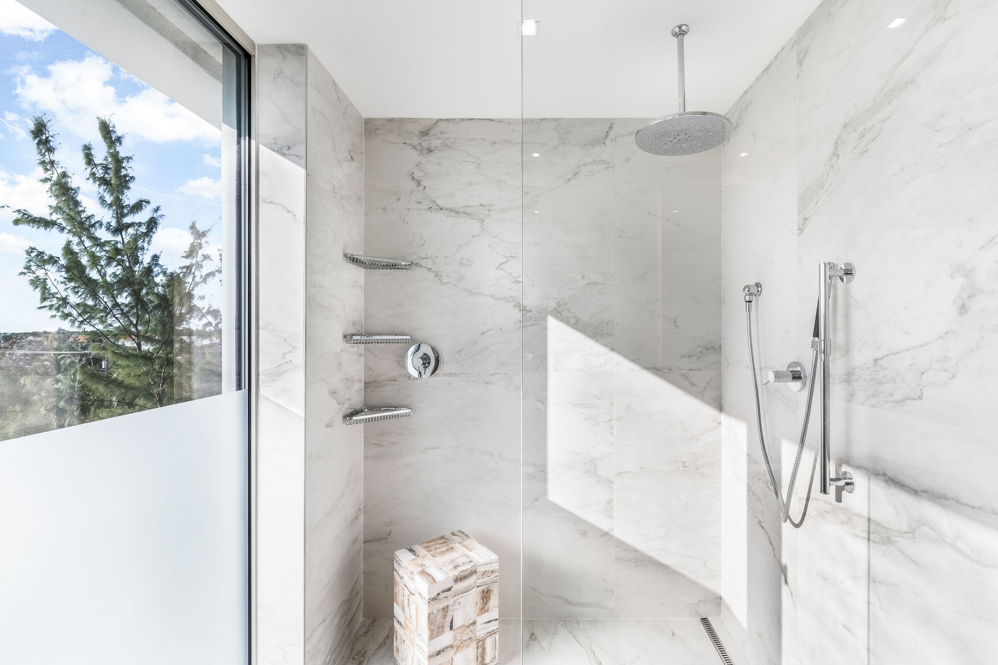 The interior has been thoughtfully designed to blend contemporary style with effortless comfort. Expansive double-height windows invite abundant natural light, highlighting the bespoke finishes, custom millwork and carefully curated lighting throughout. The open living and dining spaces create a welcoming setting for both everyday living and entertaining, flowing naturally onto a generous private terrace, perfect for evening cocktails, outdoor dining or simply taking in the horizon.